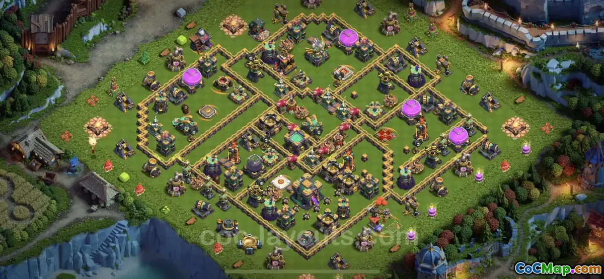 This Town Hall 14 anti-air base is highlighted as having a "Link" feature, which likely refers to a shared design or layout that players can utilize for reference or direct copying. The effectiveness of this base is amplified by its positioning and placement of defensive structures, ensuring that they cover vulnerable areas and are capable of targeting flying units efficiently. Players utilizing this base design can expect better defense strategies against dragon units, which are critical in the current meta of the game.