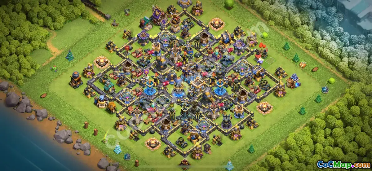 This hybrid farming base for Town Hall 18 is optimized for resource protection and defense against attacking troops. Strategically placed walls and defensive buildings create a strong barrier around storages, minimizing looting opportunities. The layout emphasizes balancing resource preservation with offensive flexibility, making it ideal for farming and clan wars alike.