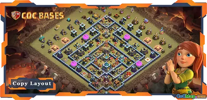 Overall, this Town Hall 13 war base layout is crafted to withstand a variety of attack strategies during wars, including Clash of Clans War and Clan War Leagues (CWL). With its strong hybrid defenses, the base is designed to protect critical resources and units, making it an excellent choice for players looking to enhance their war strategies. Properly utilizing this layout can lead to increased success in battles and contribute to a player's overall standing in the game.