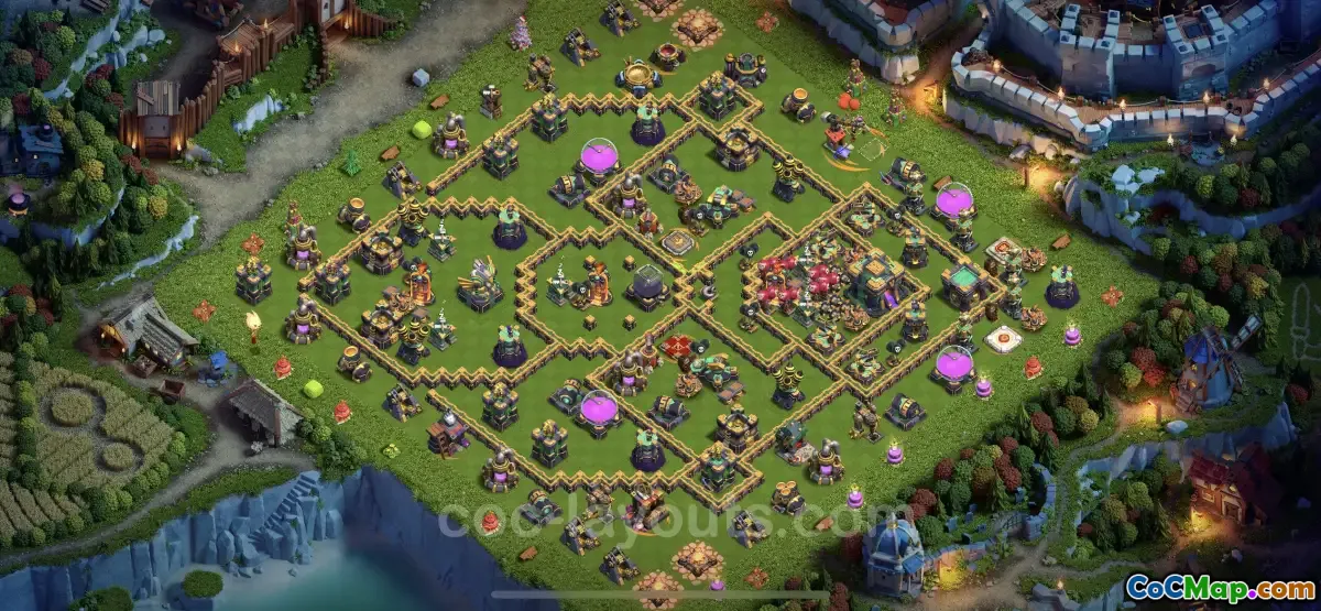 The Town Hall Level 14 base design, referred to as Base TH14 with Link Anti Dragon, is specifically crafted to enhance defenses against aerial attacks, particularly from Electro Dragons. This design integrates robust anti-air defenses that are essential in maintaining the integrity of the base during battles. Players utilizing this layout can expect increased resilience against aerial units and a higher likelihood of success in defending against attacks. The strategic placement of defensive structures aims to mitigate damage from enemy troops that primarily rely on air assaults.