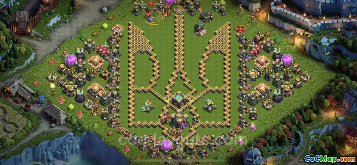 This specific base configuration is available for players looking to optimize their defensive strategy at Town Hall 14. It includes a variety of defensive buildings strategically placed to thwart attacks and protect the player's trophies. The layout considers the placement of defenses, traps, and walls to create an effective barrier against different attack strategies, which is essential for players keen on climbing the trophy leaderboard.