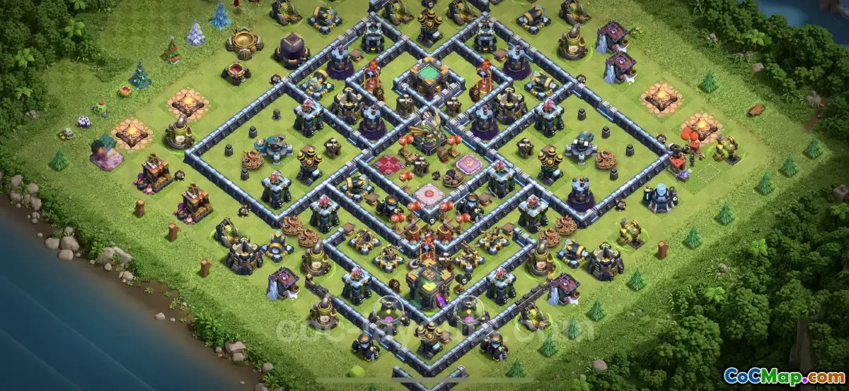 One of the defining features of this TH14 base design is its classification as "anti everything.” This means it is built to defend against a wide range of offensive tactics that players might use when attacking. The base layout incorporates clever placements of key defensive structures such as walls, traps, and defensive buildings to hinder enemy progress. This versatility and resilience enable players to fend off attacks from various troop compositions and strategies, thereby enhancing overall defensive effectiveness and increasing the chances of retaining trophies.