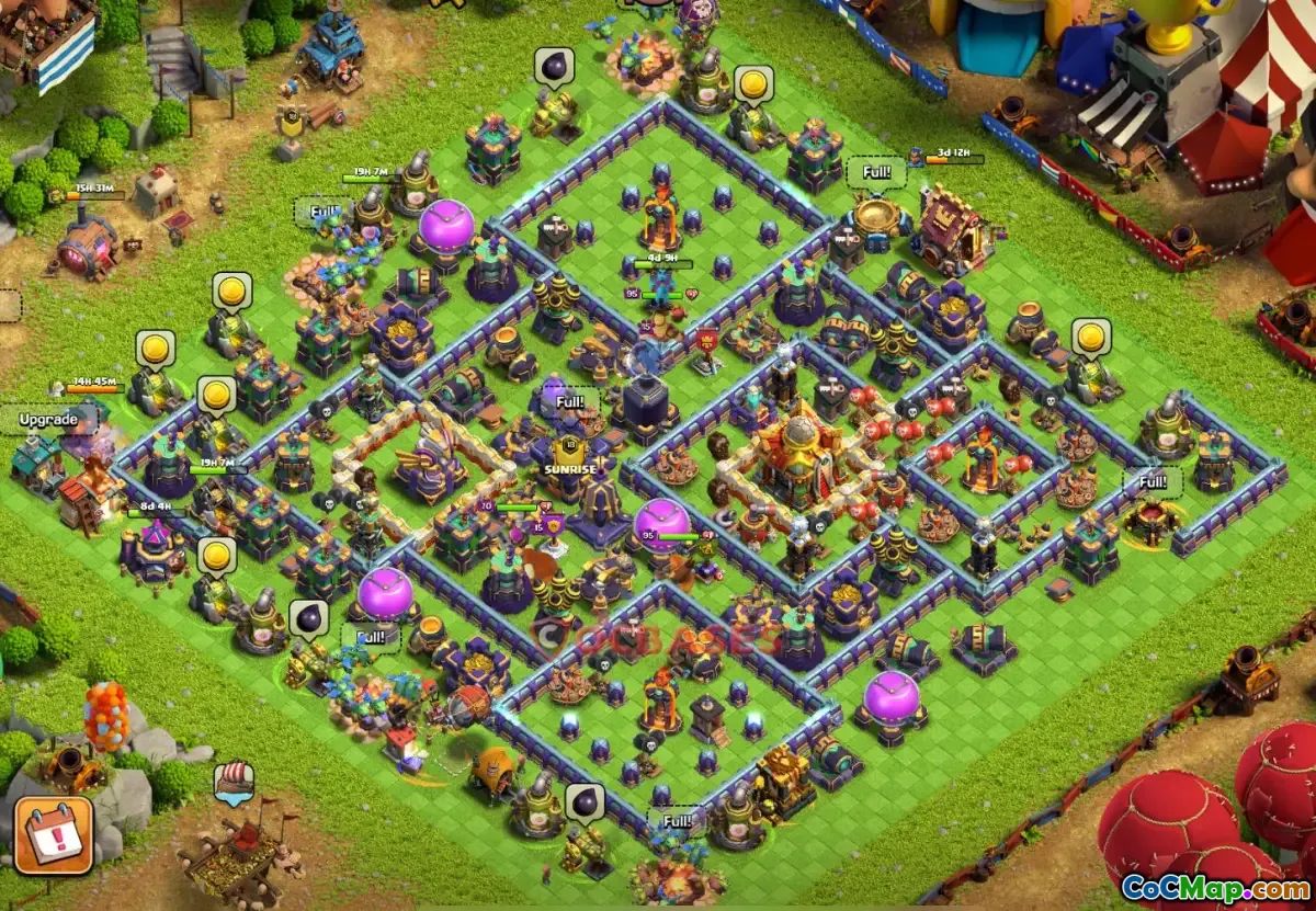 For convenience, players can access the exact layout via a copy base link, making it easy to replicate the design in their own game. This base type is ideal for players aiming for a strong, resilient defense while maintaining the ability to gather resources efficiently. The hybrid nature ensures that the base can shift focus as needed, whether to defend against aggressive attacks or to facilitate resource collection, making it a versatile and effective choice for Town Hall 16 defenders in Clash of Clans.
