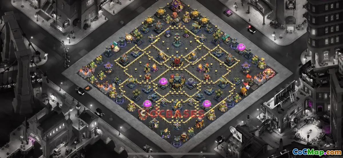 The Town Hall 17 war base in Clash of Clans is a strategic design aimed at defending against opponents in clan wars. It features a well-organized layout that prioritizes protecting key defensive structures and resources, while also making it difficult for attackers to reach the center of the base. This setup often includes a combination of walls, traps, and defensive buildings placed in a way that disrupts the enemy's attack strategies.