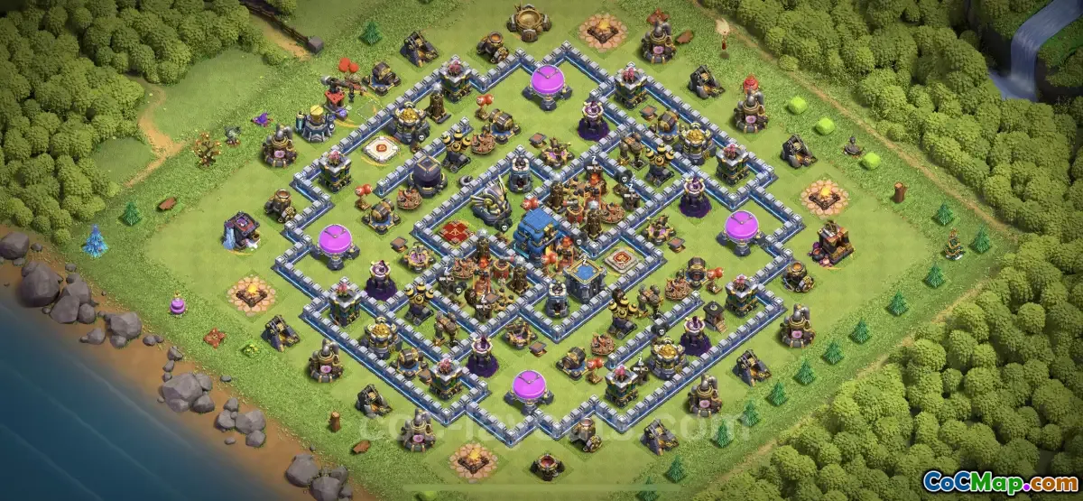 As a hybrid base, it serves both defensive and farming purposes, ensuring that players can protect their resources while maintaining a strong defense. The design cleverly integrates defensive structures such as cannons, archers, and splash damage defenses. This combination makes it harder for attackers to break through while still securing resources, making it a versatile choice for players at this level.