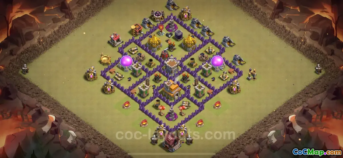 Thiết lập phòng thủ cho các căn cứ TH7 này thường có Tòa thị chính trung tâm, được bao quanh bởi các công trình phòng thủ như Đại bác, Tháp Cung thủ và Tháp Pháp sư. Cấu trúc cốt lõi này được thiết kế để ngăn chặn những kẻ tấn công bằng cách buộc chúng thực hiện một cách tiếp cận đầy thách thức, thường khiến chúng mất đi phần thưởng chính. Ngoài ra, việc bố trí bẫy và bom một cách chiến lược xung quanh căn cứ có thể khiến quân xâm lược mất cảnh giác, nâng cao hơn nữa khả năng phòng thủ.