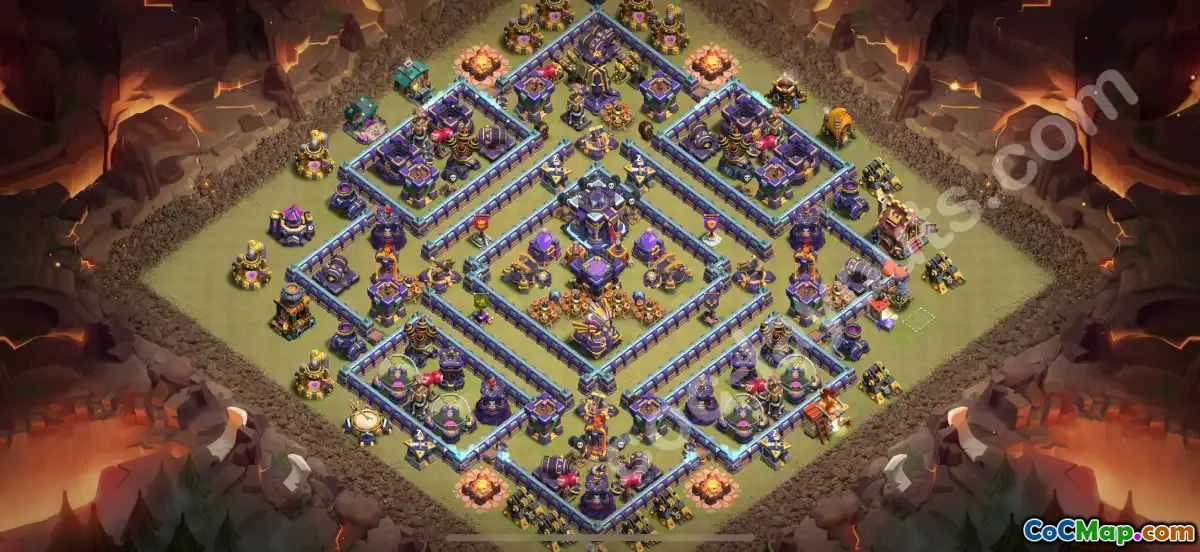 This meticulously designed Town Hall 15 war base is optimized to prevent 3-star attacks in CWL wars. Its anti-everything setup includes well-placed storages, protected key defenses, and a balanced layout that confuses and delays attackers.