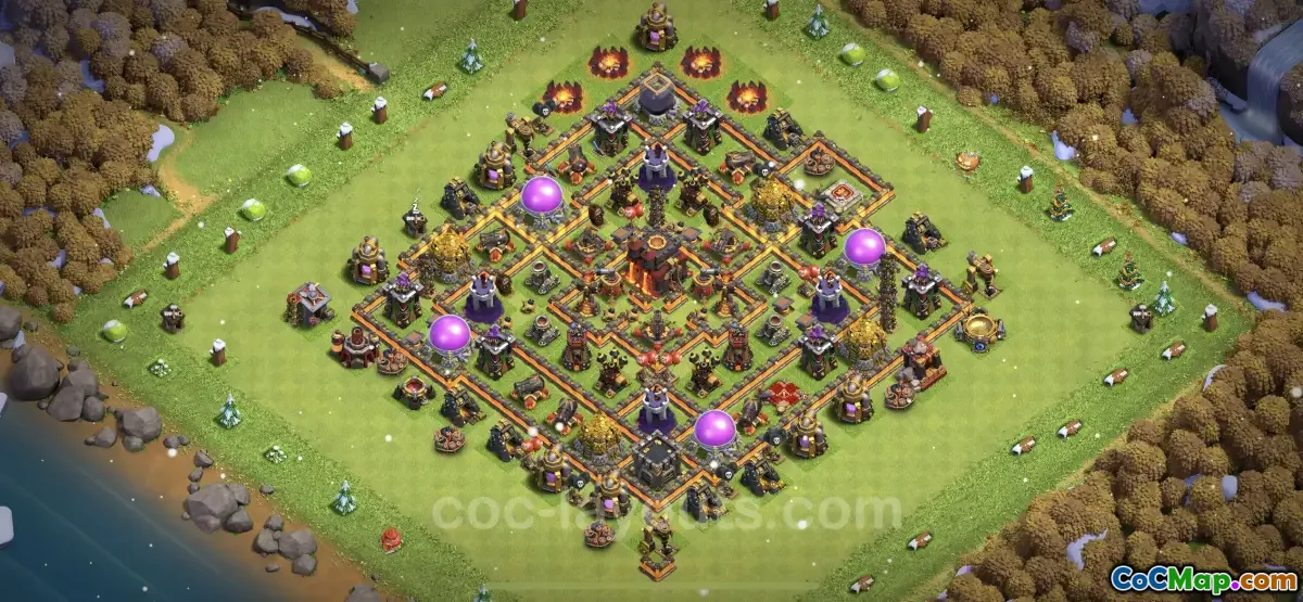 The TH10 farming base layout emphasizes a hybrid approach, combining both defensive strategies against air units and effective resource placement. This design aims to protect essential resources such as gold and elixir from enemy raids, utilizing walls, traps, and strategic building placements. Players often look for bases that effectively deter air attackers while still being functional for collecting resources, making this hybrid layout a sought-after option for those at Town Hall level 10.
