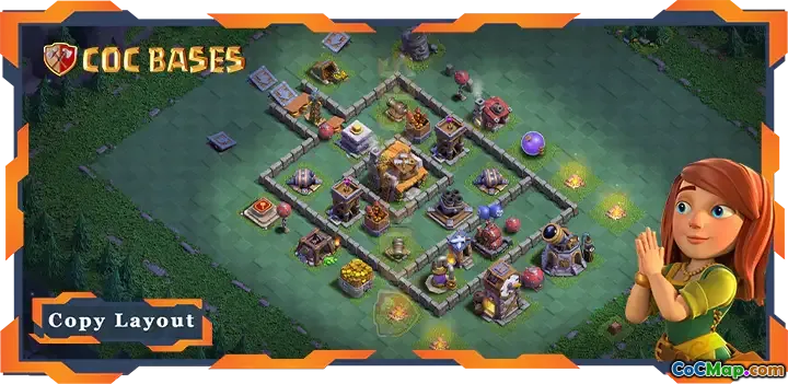 Thiết kế căn cứ có tên bh05 có cách bố trí chiến lược trong đó sảnh xây dựng nằm ở trung tâm, tạo điểm nhấn mạnh mẽ cho hệ thống phòng thủ. Bằng cách đặt sảnh xây dựng ở trung tâm, nó cho phép phân bổ hiệu quả các công trình phòng thủ xung quanh nó. Vị trí trung tâm này khiến đối thủ gặp khó khăn hơn trong việc tiếp cận hội trường xây dựng đồng thời bảo vệ nó khỏi các cuộc tấn công trực tiếp.