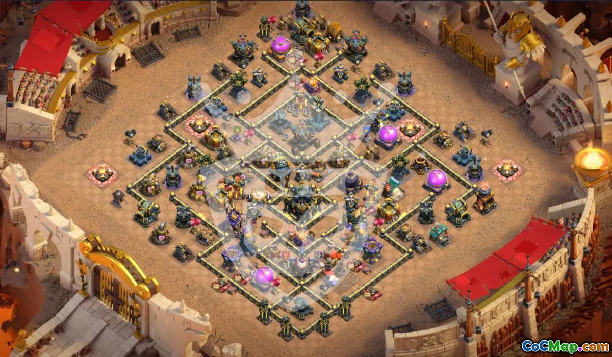 Find an expertly designed Town Hall 17 base layout perfect for both Trophy pushing and war defense. This layout balances resource protection with robust protective structures to deter attackers.