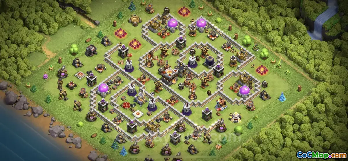 The Trophy Base for Town Hall Level 11 in Clash of Clans is designed specifically to optimize trophy collection and enhance defensive capabilities. It incorporates a strategic arrangement aimed at minimizing damage from both ground and air attacks. Given the game's evolving dynamics, this base effectively counters popular threats, particularly those involving Electro Dragons, which are common at this level of play.