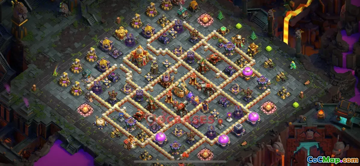 The Town Hall 16 hybrid base in Clash of Clans is designed to provide a balanced defense setup suitable for both farming and war scenarios. This type of base layout combines features of farming and defensive structures, allowing players to protect their resources while also preparing for clan wars. The design usually incorporates well-organized walls, strategically placed traps, and key defenses to deter enemy attacks and minimize damage to vital structures.