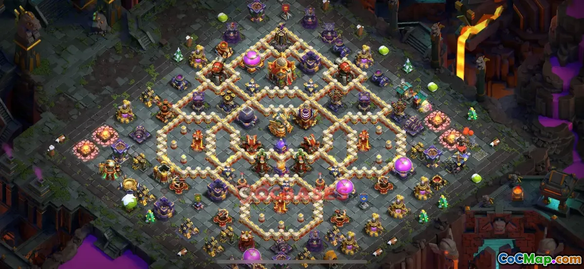 The hybrid base is specifically crafted for Town Hall 16, incorporating advanced defensive mechanisms and smartly arranged compartments. This design is effective against both ground and air assaults and aims to slow down attackers by creating multiple layers of defense. The base layout prioritizes key structures such as the Town Hall, Clan Castle, and heroes, ensuring they are well-protected and can contribute to defending against enemy invasions.