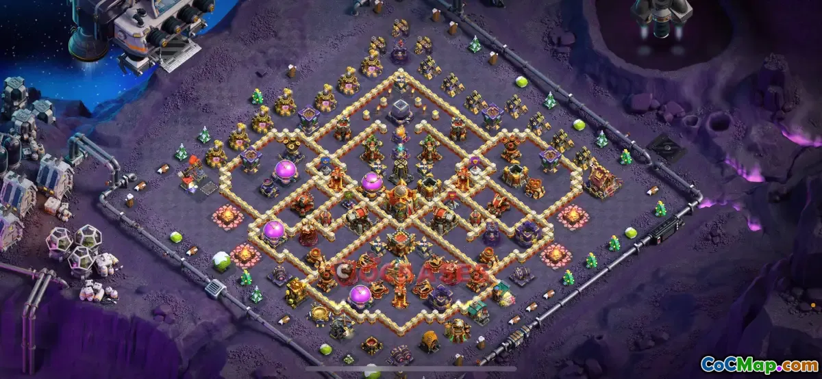 This Town Hall 16 hybrid base design in Clash of Clans is specifically crafted to provide a balanced defense strategy, making it suitable for both attacking and defending purposes. It combines elements of a farming and war base, offering protection for resources while also creating an effective layout to defend against various attack strategies. The design emphasizes strategic placement of walls, traps, and defensive structures to maximize protection and disrupt attacking troops.