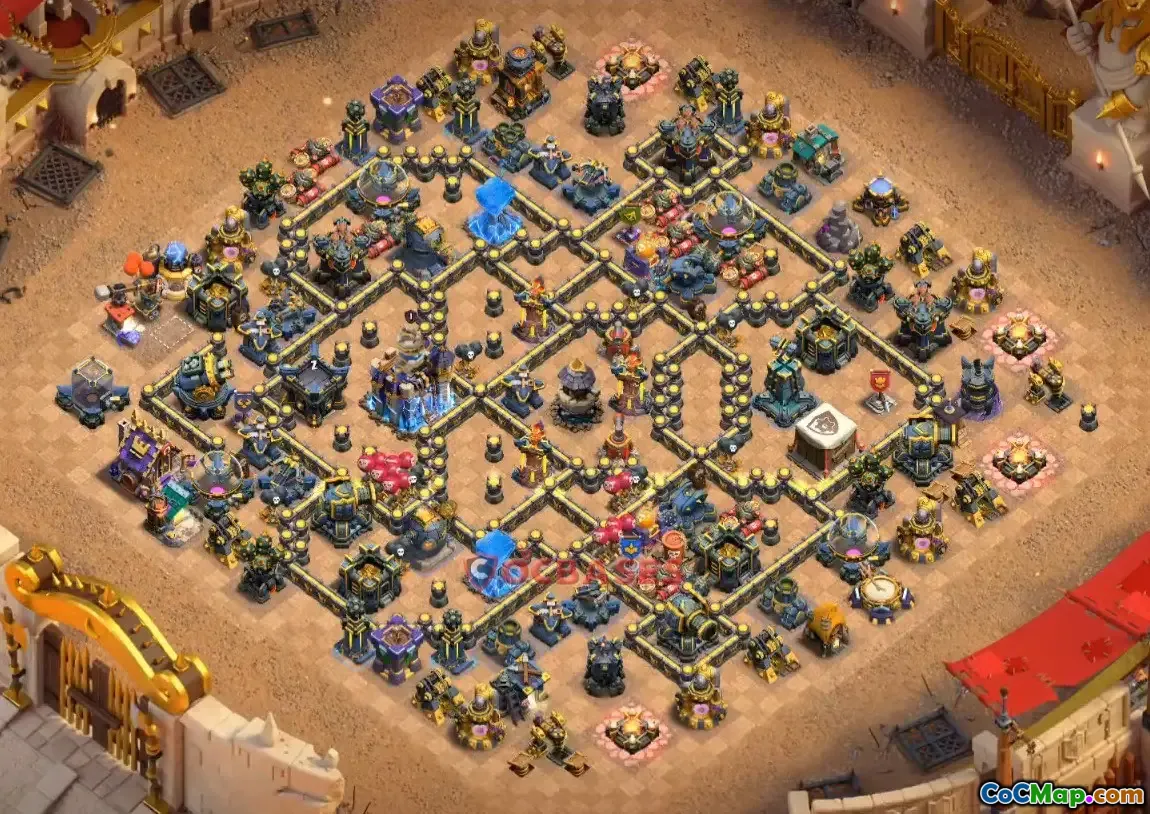Protect your Clan's victory with this expertly designed Town Hall 18 war base layout. Featuring centralized Clan Castle, well-distributed defenses, and strategic compartmentalization, this base maximizes defense against both air and ground attacks. Perfect for deflecting the most common attack strategies and safeguarding your resources during war.