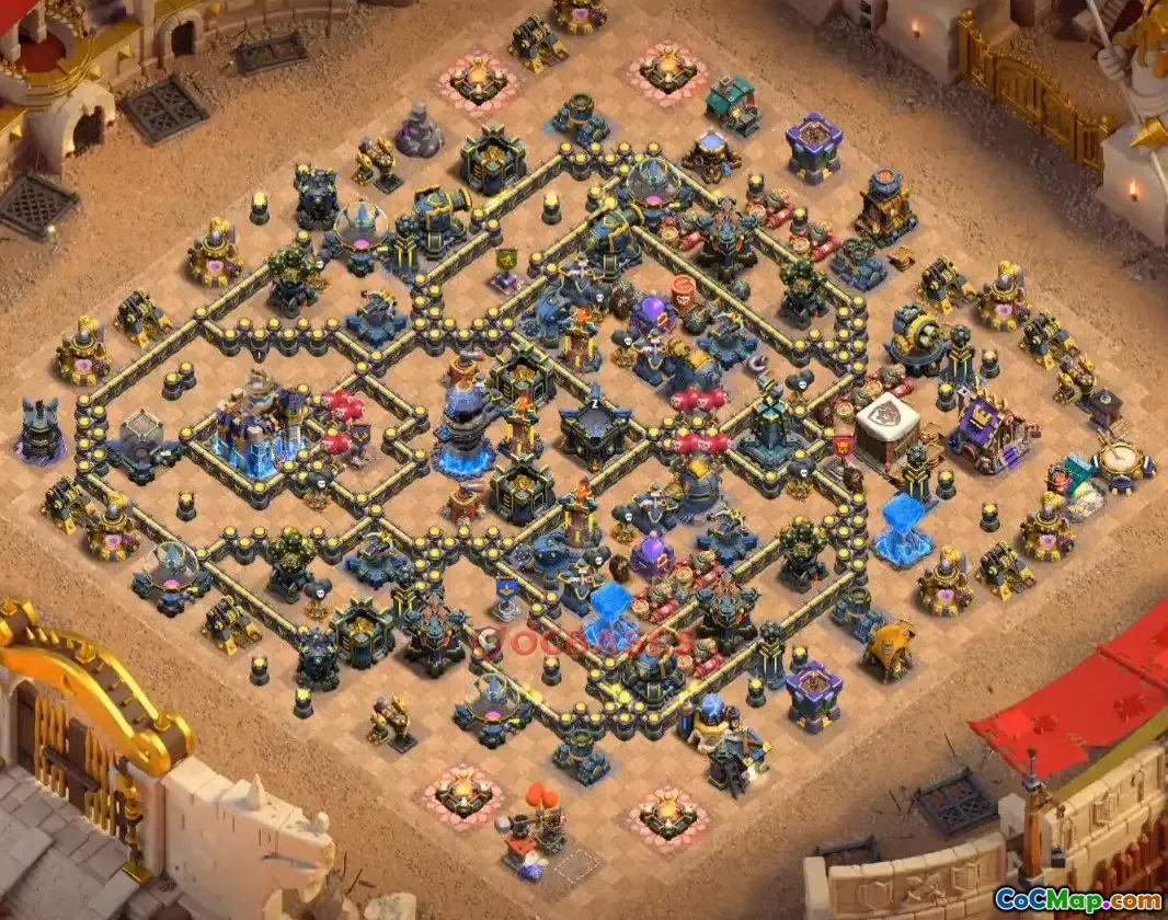 This Town Hall 18 war base is optimized to defend against high-level attacks, featuring well-placed defenses, strategic trap placement, and a centralized Clan Castle for better protection. Its layout minimizes air and ground vulnerabilities, making it a strong choice for Clan wars.
