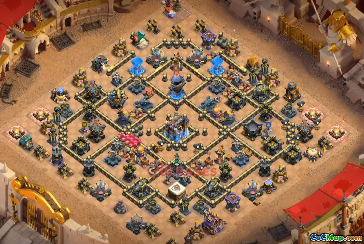 The Town Hall 18 war base is crafted to maximize defense and protect your resources during clan wars. The layout strategically places key defenses and traps to challenge attackers and prevent easy wins. Its centralized Town Hall is well-guarded by high-damage defenses, while the perimeter defenses are arranged to slow down and divert enemy troops effectively.