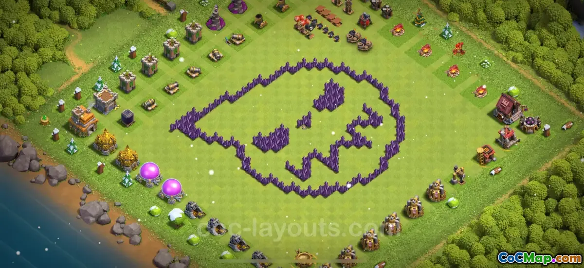 这个有趣的巨魔基地具有巧妙的防御和建筑物布局,经常将攻击者引入陷阱。它是艺术和策略的融合,设计不仅是为了美观,也是为了游戏玩法的实用性。这种布局的目的是误导对手,常常让他们相信自己有一条明确的胜利之路,结果却成为战略性陷阱和防御单位的牺牲品。这为战斗增添了娱乐元素,根据结果,通常会导致攻击者或防御者开怀大笑。