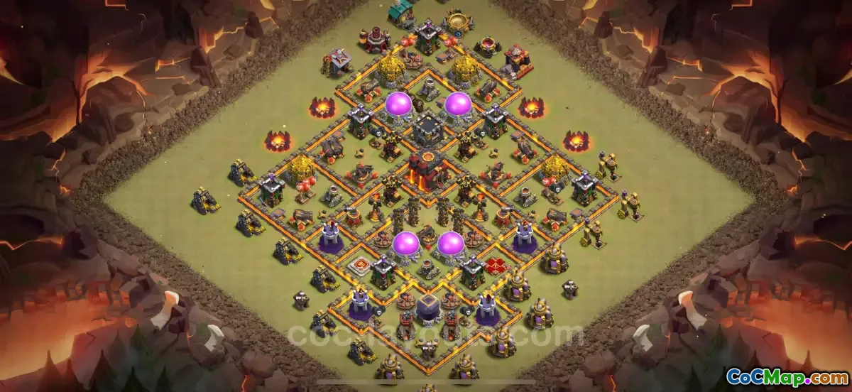 10 号市政厅的混合基地旨在保护长生不老药和黄金储藏室,同时也保护市政厅。该设计通常包含强大的防御结构,如地狱塔、巫师塔和隐藏特斯拉,战略性地放置以覆盖尽可能多的地面。通过分散防御并在基地内创建隔间,玩家可以延迟和扰乱攻击部队,迫使他们改变策略。这不仅有助于保护资源,还增加了对手无法获得三星级胜利的可能性。