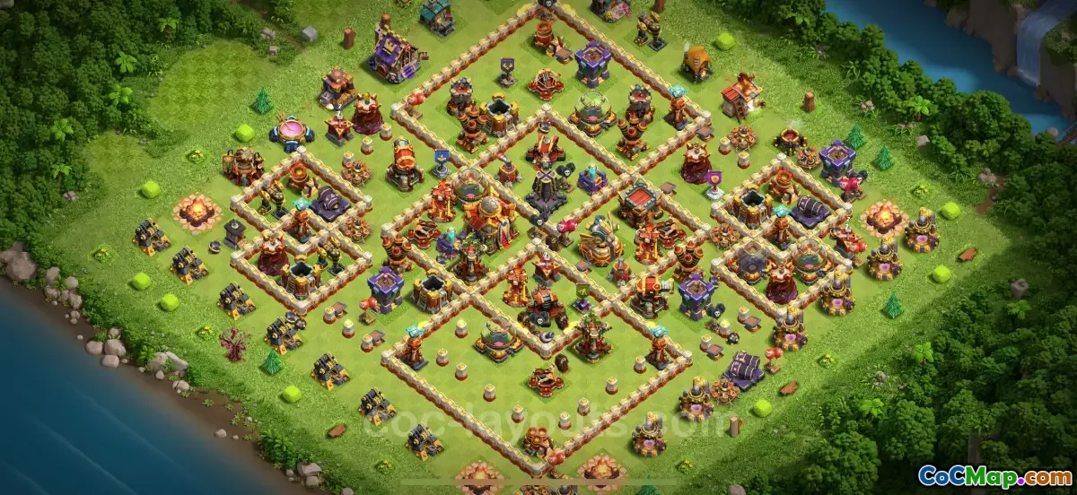 The design balances offense and defense by distributing splash damage across the map and using trap timing to punish rushed sieges. Strong clan-war reliability comes from a sturdy core and versatile outside ring that can adapt to various armies, from Lalo to Queen Walk hybrids.