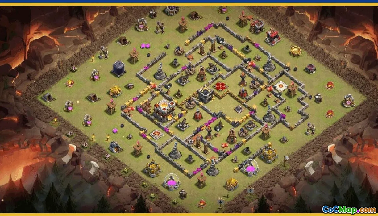 The base layout includes a variety of options to suit different defensive needs and gameplay styles. The home village layout focuses on resource protection and overall defense, while the war base is optimized to defend against enemy attacks in clan wars. Trophy bases aim to preserve the player's current ranking by making attacks difficult, and the map sections offer a broad view of available setups to choose from according to personal preferences or clan requirements.