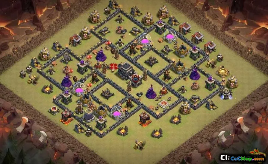 市政厅9的部落基本布局的冲突旨在增强防御和保护资源,同时允许收集有效的奖杯。在这个级别上,玩家可以使用新的防御建筑和陷阱,可以将其策略性地放置以创建一个强大的家乡。玩家需要专注于迫使攻击者在多层防御措施中导航的布局,鼓励他们浪费时间和资源来突袭村庄。实验不同的安排有助于确定确保奖杯和资源的最有效策略。