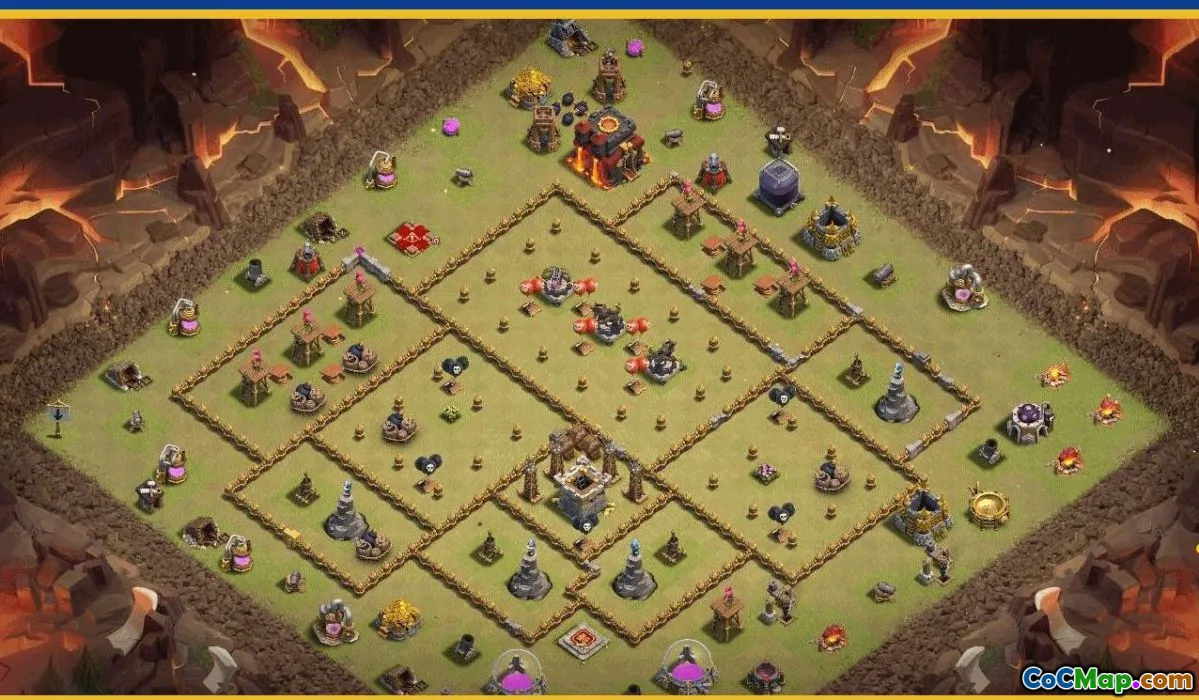 For Town Hall 10, various base layouts are available that incorporate the latest defenses like inferno towers and new walls. The home village layout focuses on maximizing protection of resources like gold, elixir, and dark elixir, while also establishing a strong defense against different attack strategies. War bases are designed to confuse and trap attacking troops, often positioning key defenses in strategic locations to prevent easy access and ensure the destruction of enemy troops.