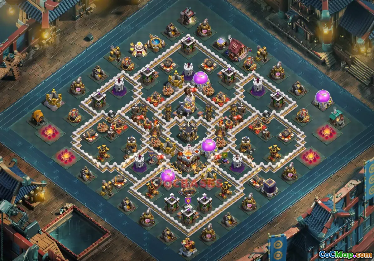 This Town Hall 11 trophy base is expertly crafted to defend against attackers while maximizing trophy gains. Its strategic placement of defenses and traps ensures a stronghold that resists common attack strategies, making it ideal for players aiming to climb the ranks.