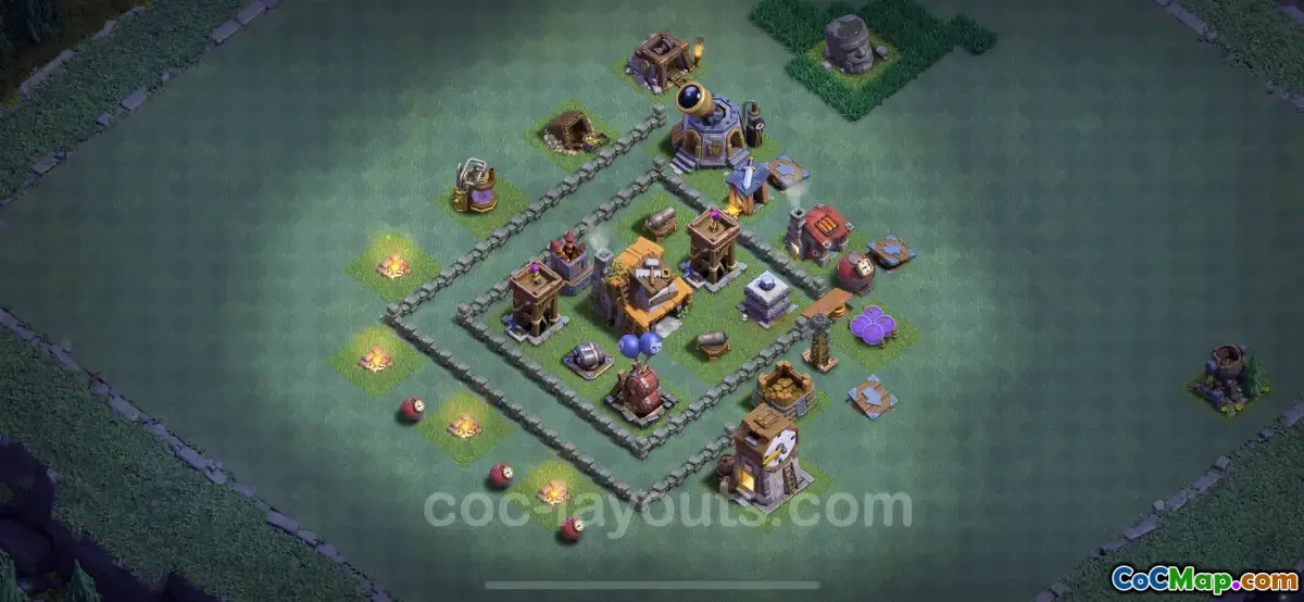 The Base offers unique placement strategies and defensive structures that work well at Builder Hall Level 4. Players can utilize this layout to enhance their chances of withstanding assaults by opponents. The design typically includes strategically positioned defensive buildings, such as cannons and archer towers, along with the ideal placement of traps and other defenses to confuse and deter attackers.