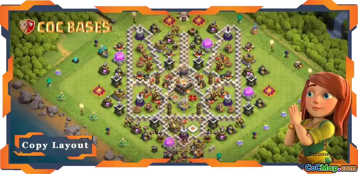 Town Hall 11 奖杯基地的设计采用了注重防御的战略布局。市政厅的中心位置是该基地的重要组成部分,使其能够受到良好的保护,免受入侵攻击。通过将其放置在基地的中心,攻击者必须穿过各种防御才能到达它,从而增加了成功防御敌军的可能性。