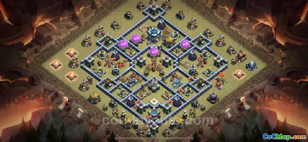 This top War TH13 base comes with a design that factors in the most common attack patterns used by opponents, adapting to both high-level strategies and the various troop combinations they deploy. The layout not only protects key structures like the Town Hall and clan castle but also ensures that traps and defensive units are strategically placed to capitalize on enemy movements. This increases the likelihood of defeating attackers or forcing them to spend more troops than they had planned, thereby preserving the base's integrity.