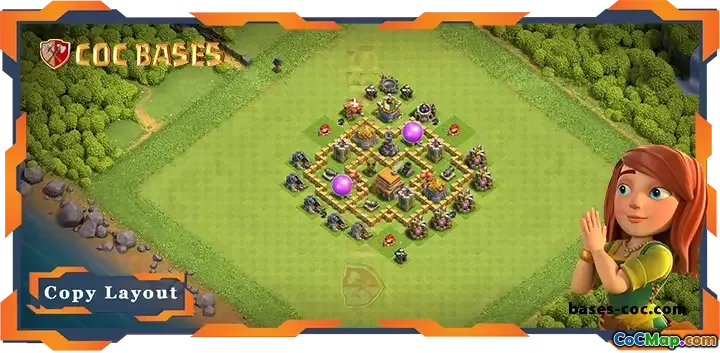 This Top Anti 3 Star Base layout for Town Hall 5 is designed to maximize defensive strength and prevent opponents from achieving a three-star attack. The base strategically positions key defenses such as cannons, archer towers, and air defenses to cover critical areas and protect the core. The placement of walls creates compartments that slow enemy units and limit their movement, making it harder for attackers to break through.