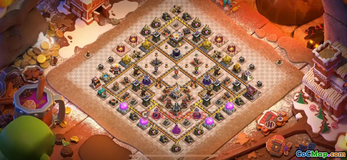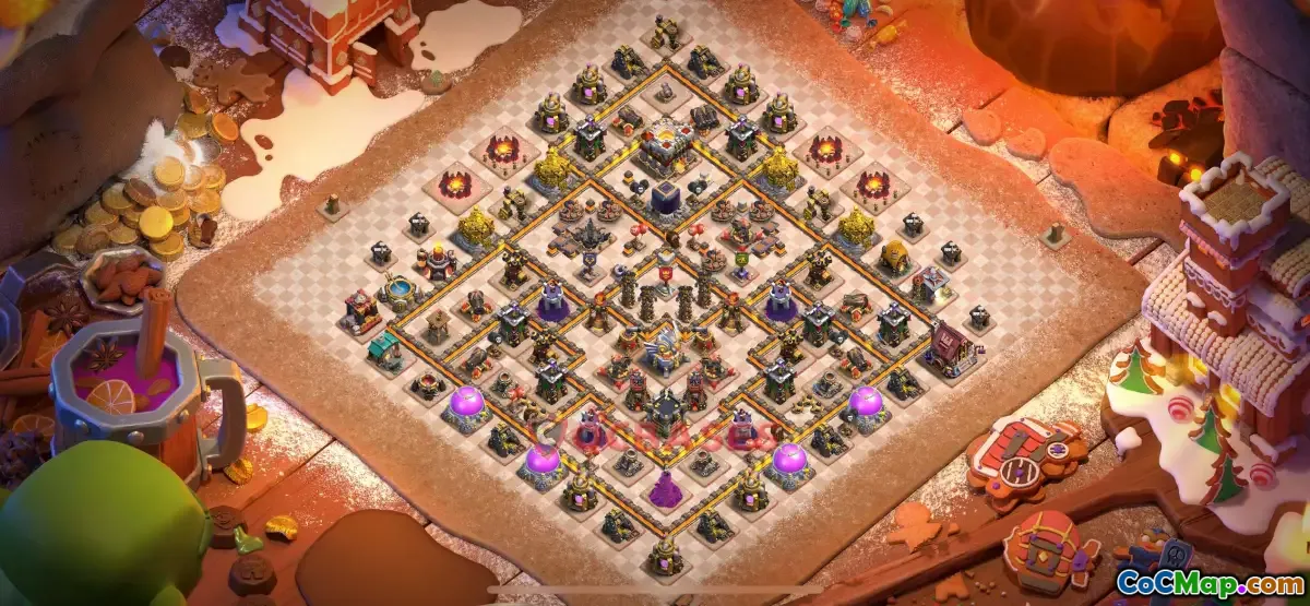 This Town Hall 11 trophy base is specially crafted to maximize defense against enemy attacks, helping players protect their trophies while resisting 3-star raids. The layout strategically places defensive structures such as Inferno Towers, X-Bows, and Spread Out Clan Castles to create a robust barrier that confuses and traps aggressive attackers.