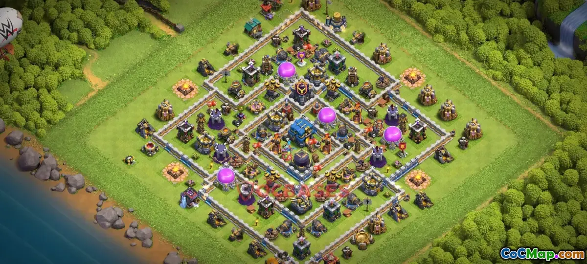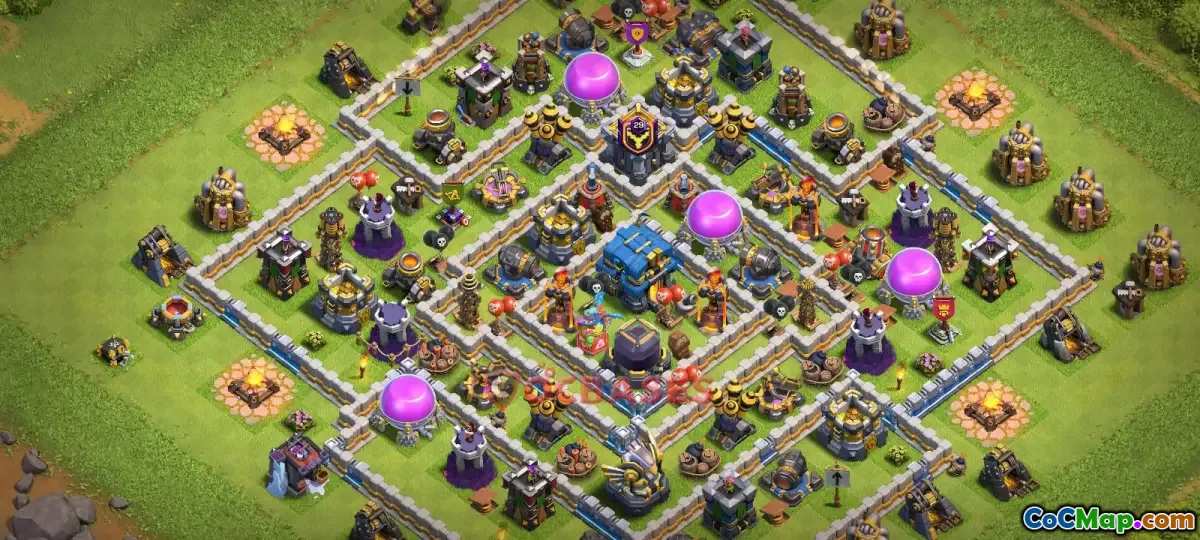 This hybrid base is considered very effective for both defending your resources and gaining trophies during attacks. It combines elements of both farming and war bases, making it versatile for various gameplay strategies. Proper placement of the key defenses like Archer Towers, Cannons, and Air Defenses, along with well-guarded resource storages, helps maintain a stronghold that can withstand oncoming assaults from other players.