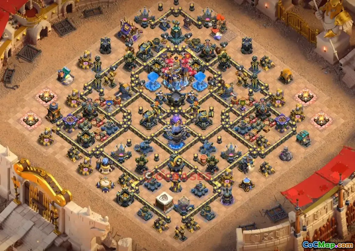The Town Hall 18 war base is designed to provide maximum defense against attacking troops during clan wars. Its strategic placement of walls, traps, and defensive buildings creates a robust shield around the core, preventing attackers from easily reaching the Town Hall and resources.